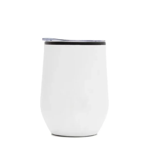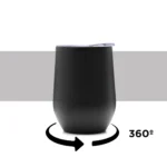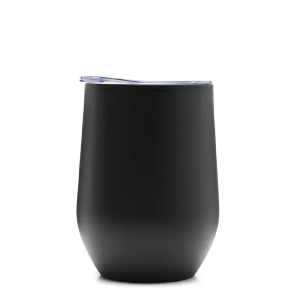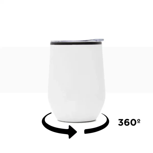Mug térmico realizado en acero inoxidable esmaltado en su exterior, con interior de polipropileno negro y tapa cristal clear.
