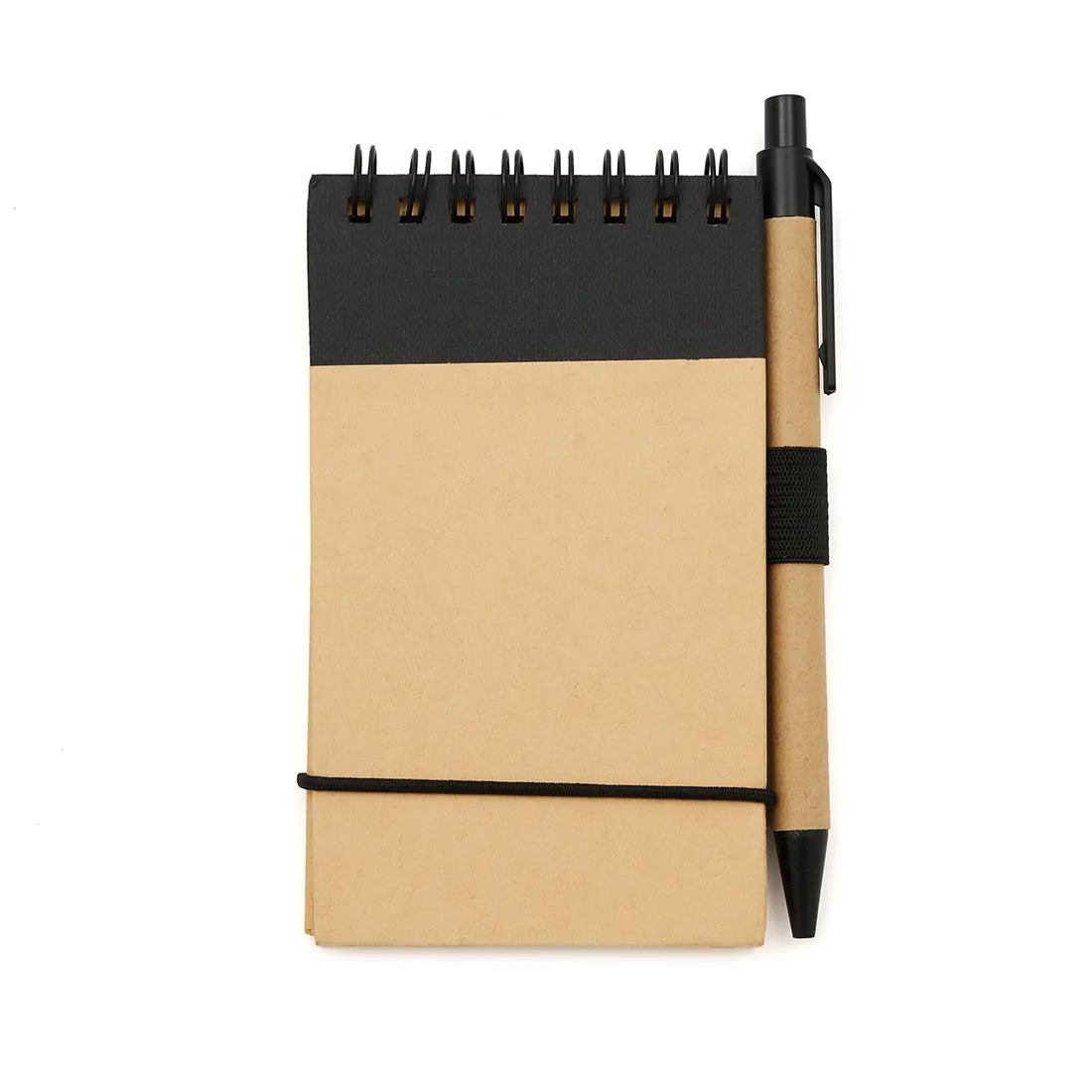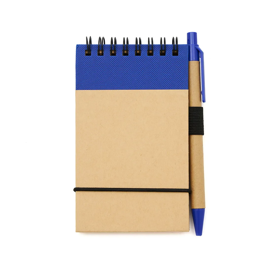 Cuenta con tapa rígida, espiral superior, banda elástica y bolígrafo incorporado. Disponible en colores negro, azul y rojo.
