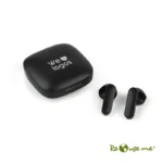 Auriculares inalámbricos estilo earbuds, fabricados en RABS. Cada auricular cuenta con un botón touch que permite subir y bajar el volumen, contestar y finalizar llamadas, reproducir y pausar música, cambiar a la siguiente o anterior canción.