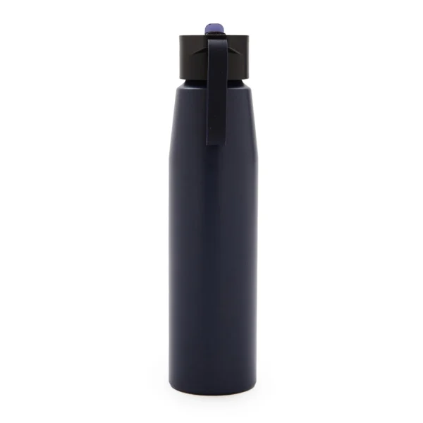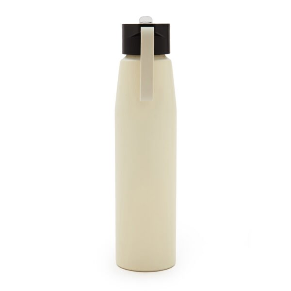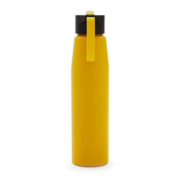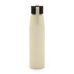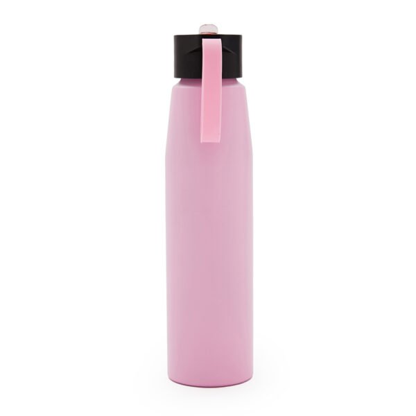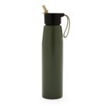 Botella de aluminio con tapa de PP negra a rosca con boquilla de PS y sorbete PE. Cuenta con una correa de silicona a tono con el color elegido para facilitar el agarre.