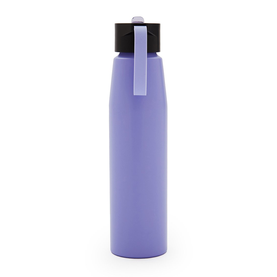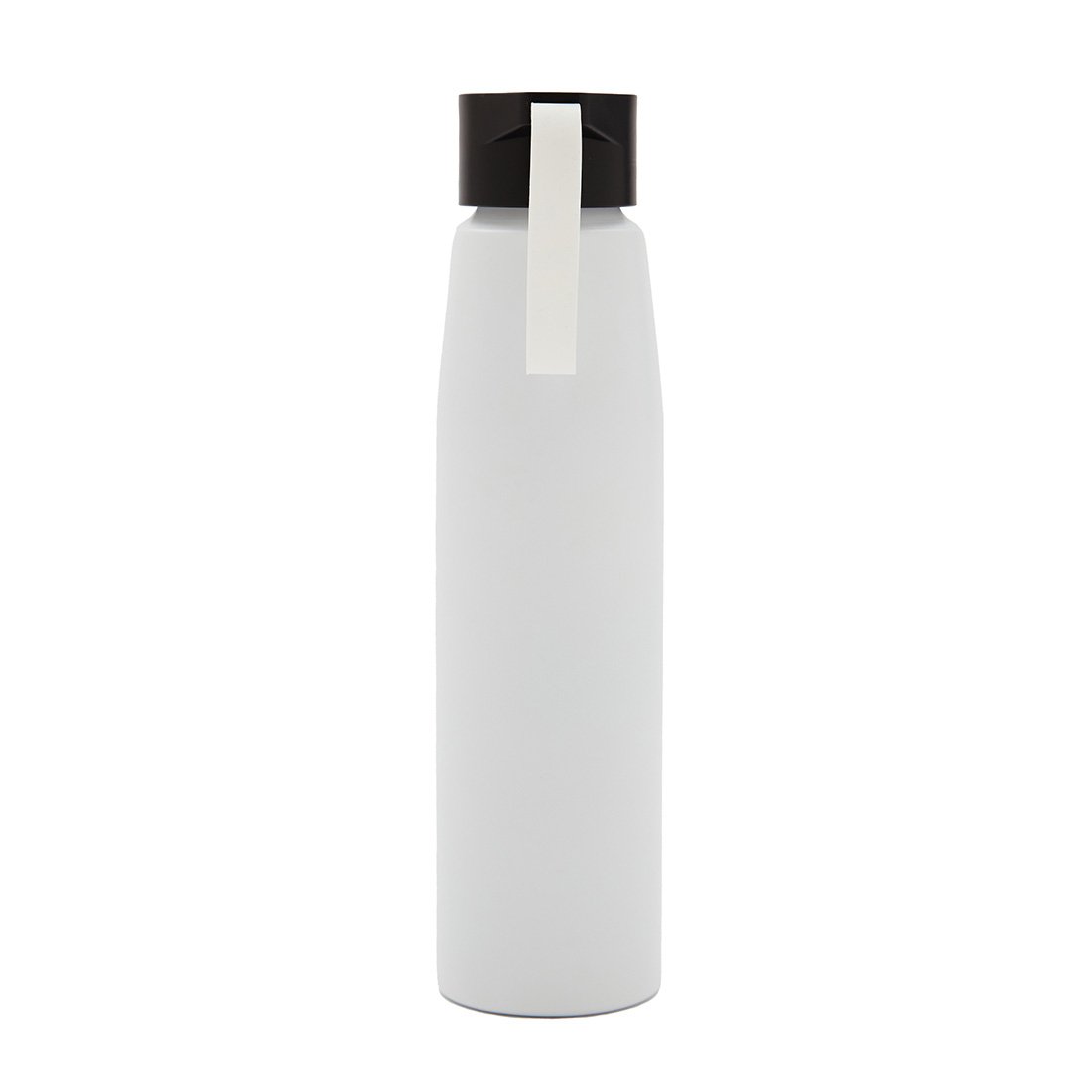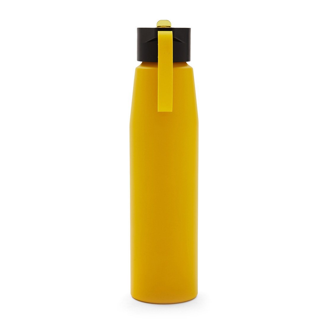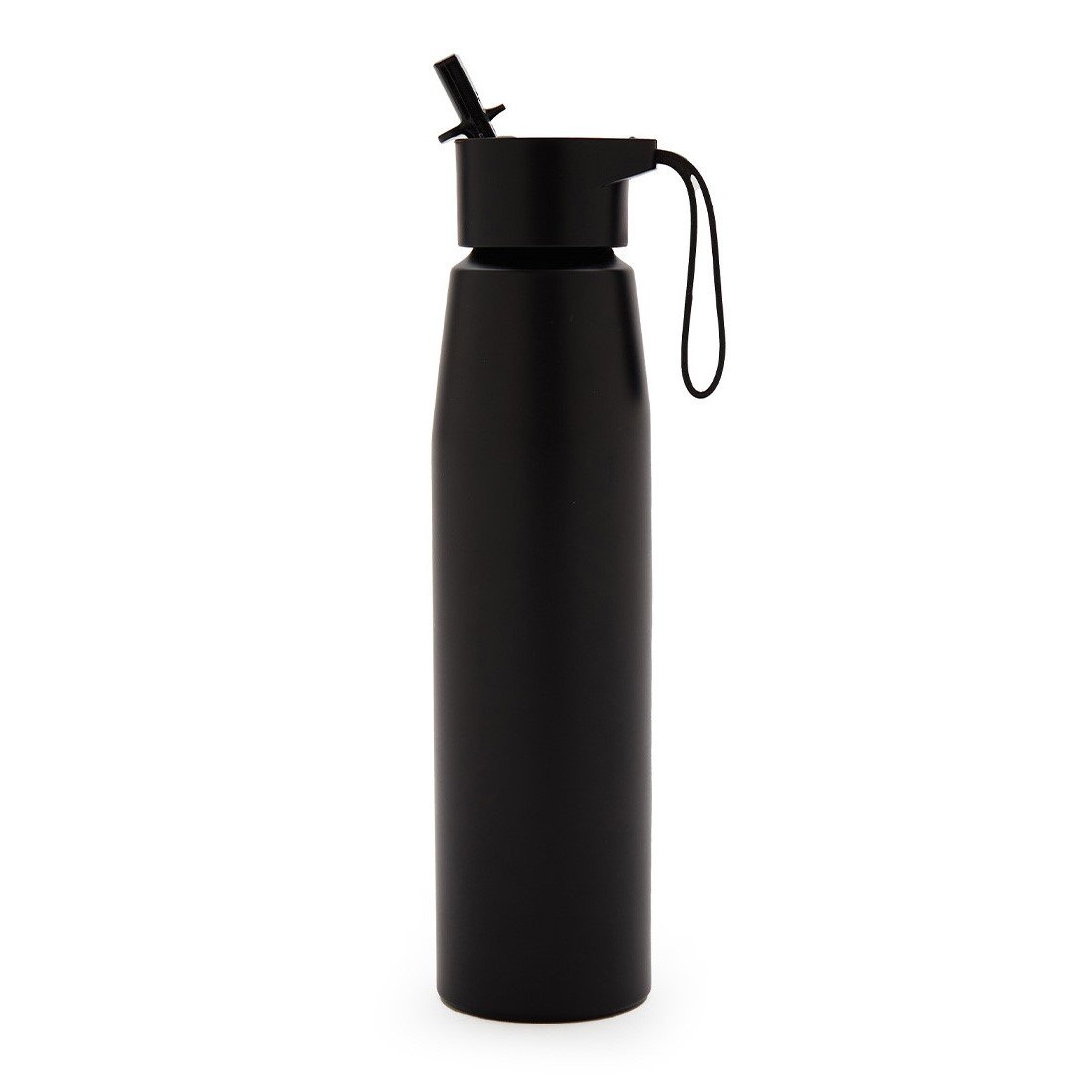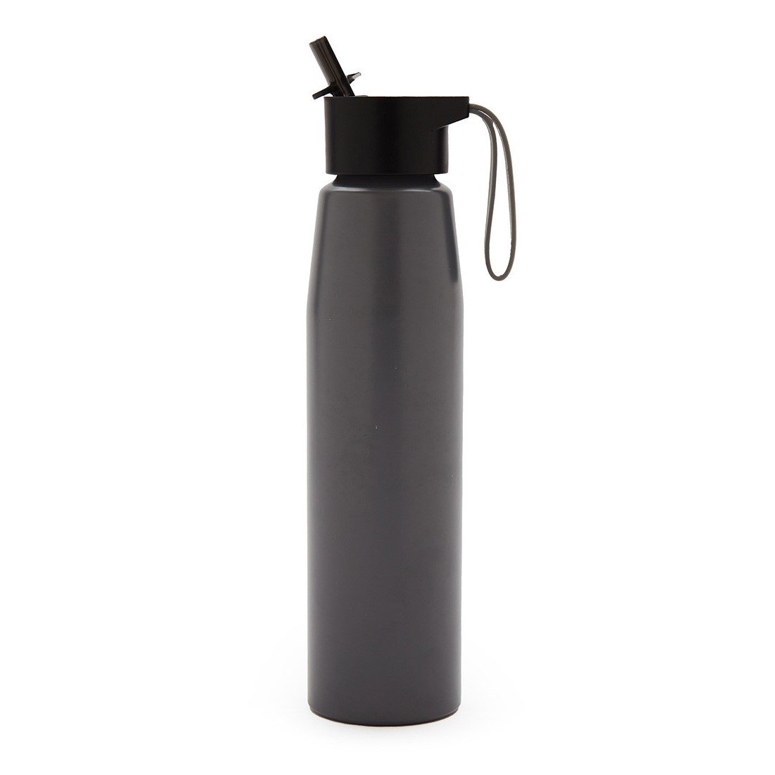 Botella de aluminio con tapa de PP negra a rosca con boquilla de PS y sorbete PE. Cuenta con una correa de silicona a tono con el color elegido para facilitar el agarre.