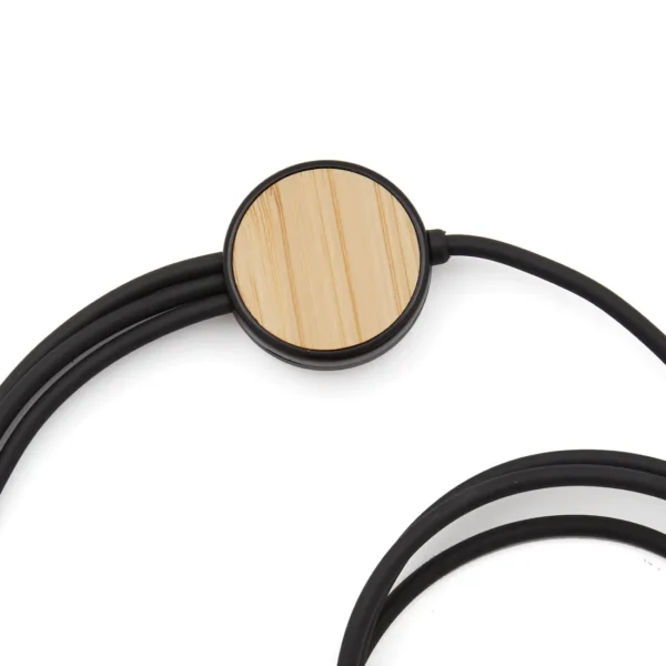 Cable 3 en 1 color negro. Es el accesorio perfecto para mantener tus dispositivos siempre cargados y listos para usar. Cuenta con un cable de entrada tipo C con adaptador USB A y 3 cables de salida TIPO C / MICRO B / LIGHTING, lo que te permite cargar dispositivos con diferentes tipos de entradas. También, cuenta con un accesorio redondo de bamboo de donde salen los 3 cables. ReUseMe