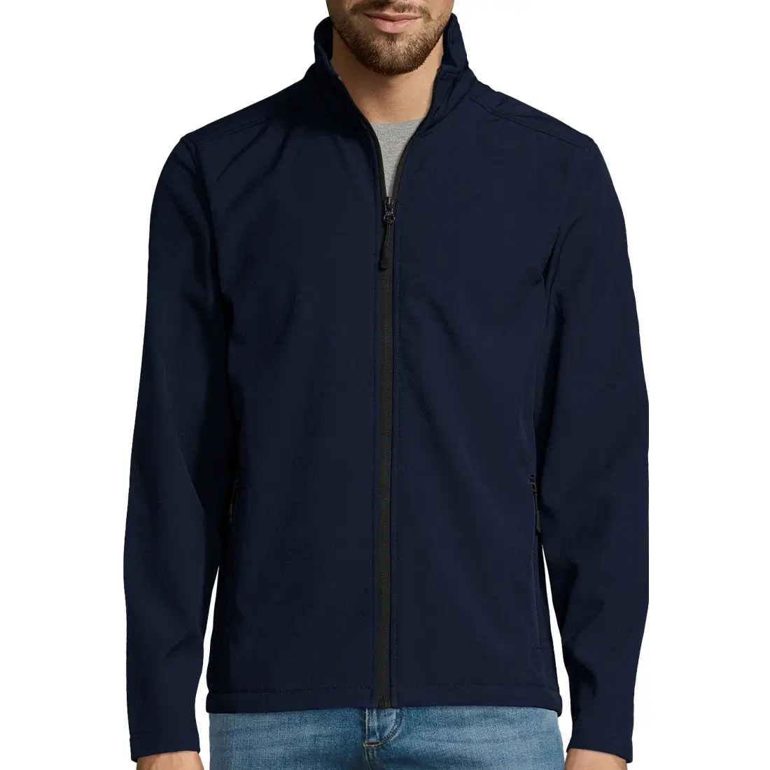 Chaqueta de softshell 280g 96% poliéster 4% elastáno con tela exterior impermeable e interior de polar. Cuenta con 2 bolsillos laterales con cierre.