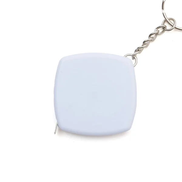Llavero con cinta métrica retráctil fabricado en ABS y cloruro de polivinilo, garantizando resistencia y durabilidad.