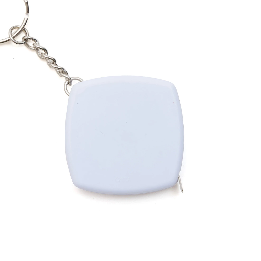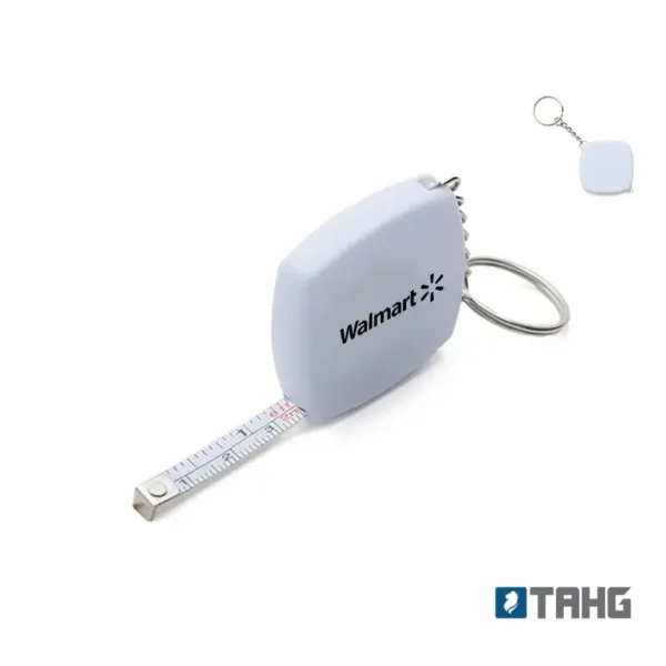 Llavero con cinta métrica retráctil fabricado en ABS y cloruro de polivinilo, garantizando resistencia y durabilidad.