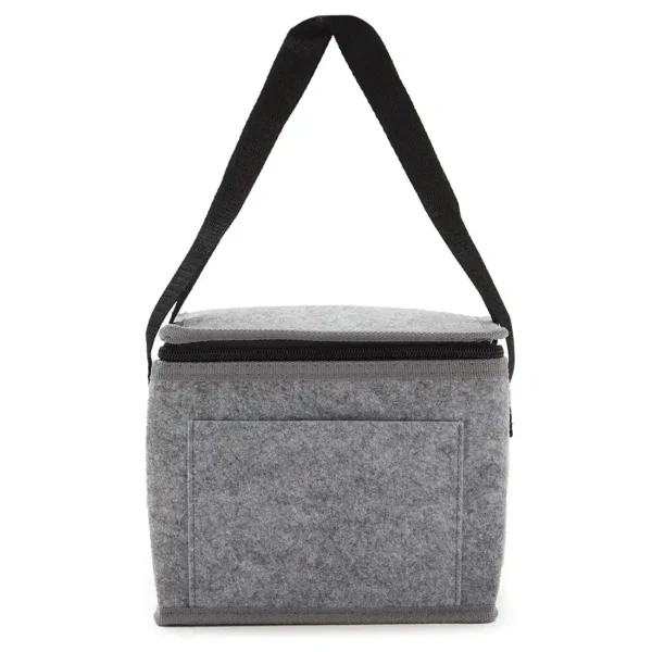 Cooler fabricado en fieltro de RPET, confeccionada a partir de botellas recicladas, con 2mm de espuma de polietileno laminado con película de aluminio. Ideal para transportar comida y bebida, conservando el frío. Dimensiones: 20,5 x 18 x 15 cm. Capacidad 5L. Reuseme.