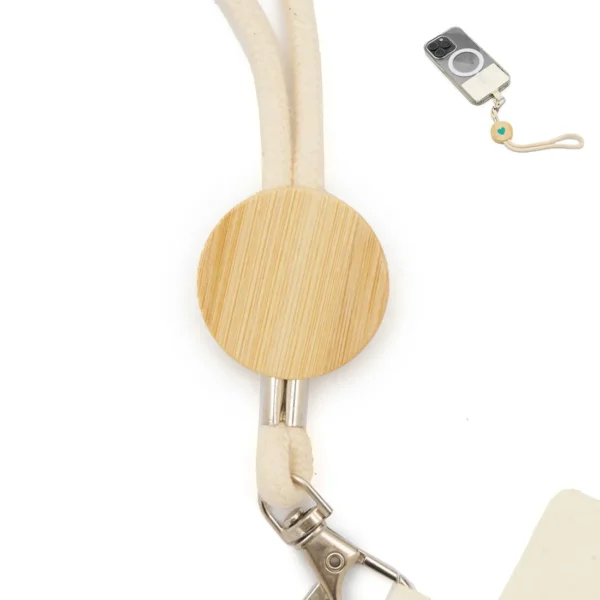 Incorpora un detalle circular de bambú que no solo aporta un toque distintivo al diseño, sino que también permite ajustar la correa a tu muñeca para mayor seguridad. Ideal para llevar tu dispositivo de forma práctica y accesible durante el trabajo, eventos o actividades diarias.