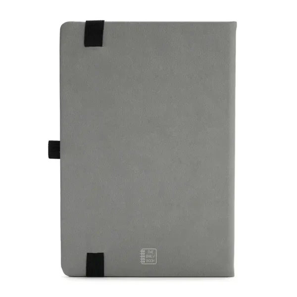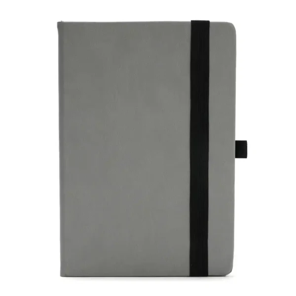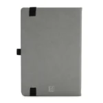 Cuaderno con tapa dura confeccionada en PU (poliuretano) color gris. Cuenta con 96 hojas rayadas de 70 g, perfectas para tomar notas, escribir ideas o planificar la jornada e incluye cinta señaladora.