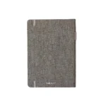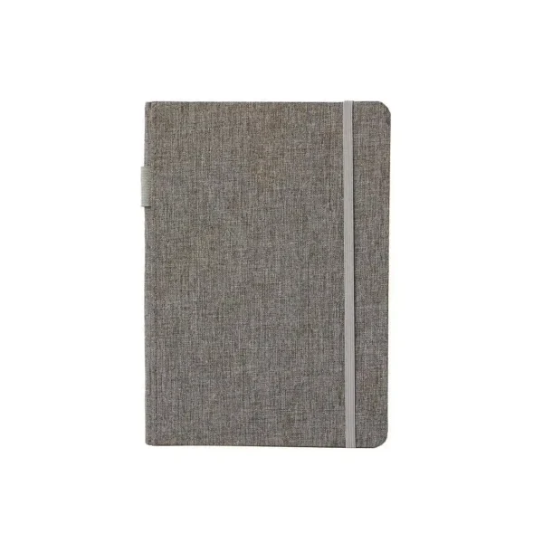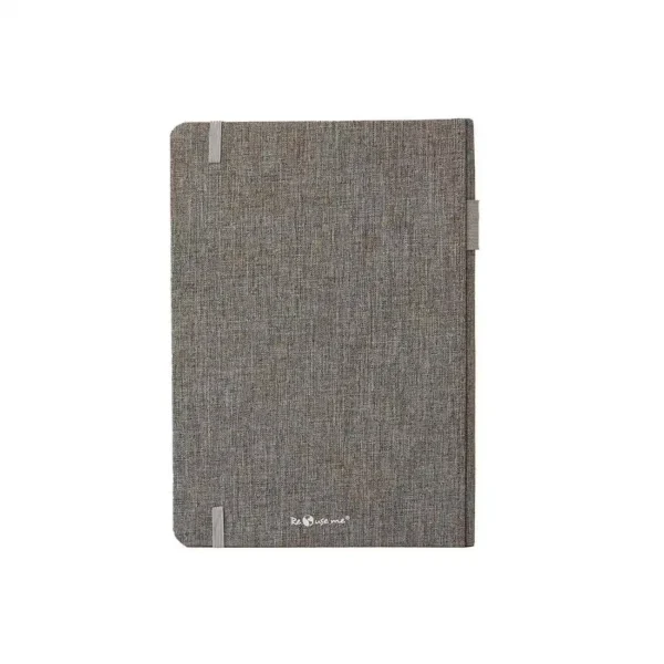Cuaderno ecológico de tapa dura fabricado en RPET reciclado. Cuenta con 96 hojas lisas color marfil de papel de piedra, de escritura suave, más duradero y resistente que el papel tradicional. Cuenta con banda elástica de 6 mm en la tapa, porta bolígrafo elástico de 1,5 cm y cinta señaladora. Es ideal para tomar notas en la oficina, la universidad o reuniones corporativas con un estilo profesional y sustentable.