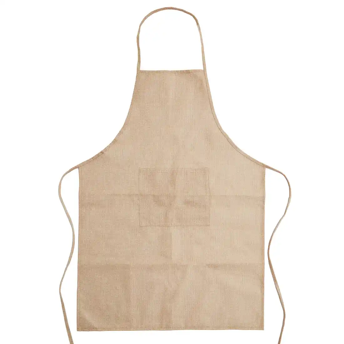 El delantal de ReUseMe está confeccionado en tela de Jute laminada con TNT, tela no tejida. Cuenta con dos tiras regulables para atar en la cintura y un bolsillo frontal.