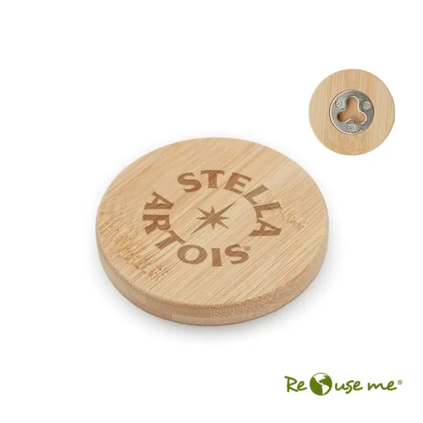 Destapador abrebotellas circular fabricado en bambú y metal. Dimensiones: 6 cm. ReUseMe