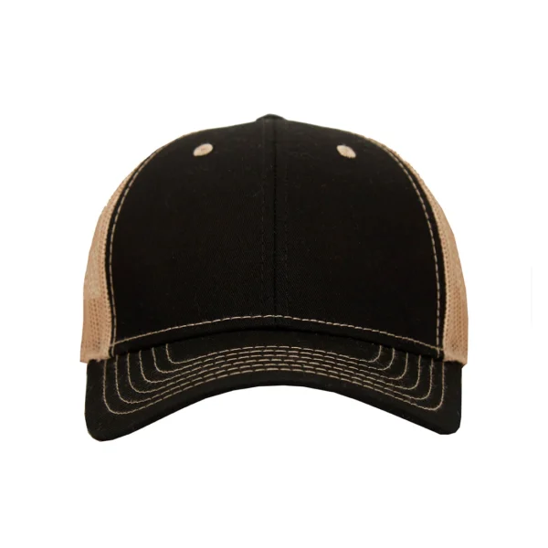 Jockey de 6 gajos con visera. El dorso del del gorro cuenta con diseño de tela de red de color kaki y ajuste con broche. Posee un sticker metalizado en la visera.