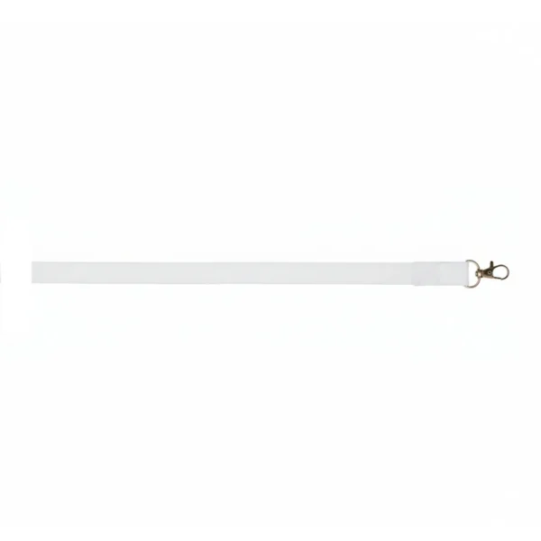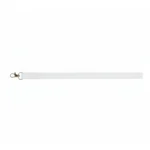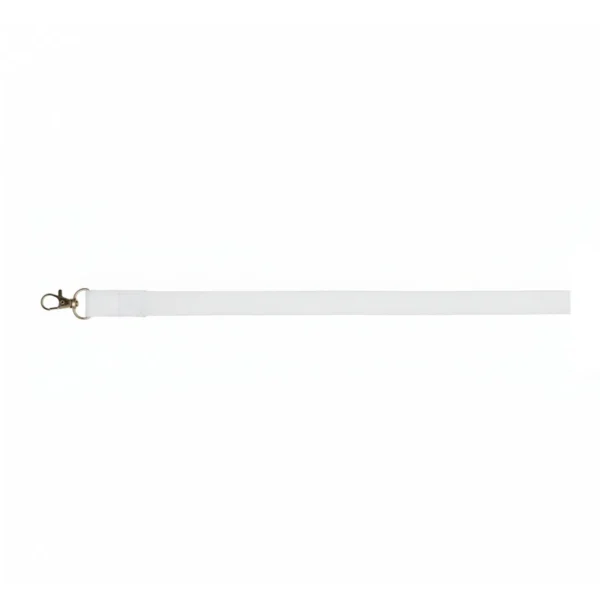 Cinta porta credencial blanca de poliéster con gancho metálico, fabricada en poliéster y aleación de zinc. Cuenta con doble mosquetón metálico resistente que asegura credenciales e identificaciones de manera práctica y segura. Es ideal para empresas, instituciones educativas, ferias, congresos y todo tipo de eventos donde se requiera portar identificación visible.
