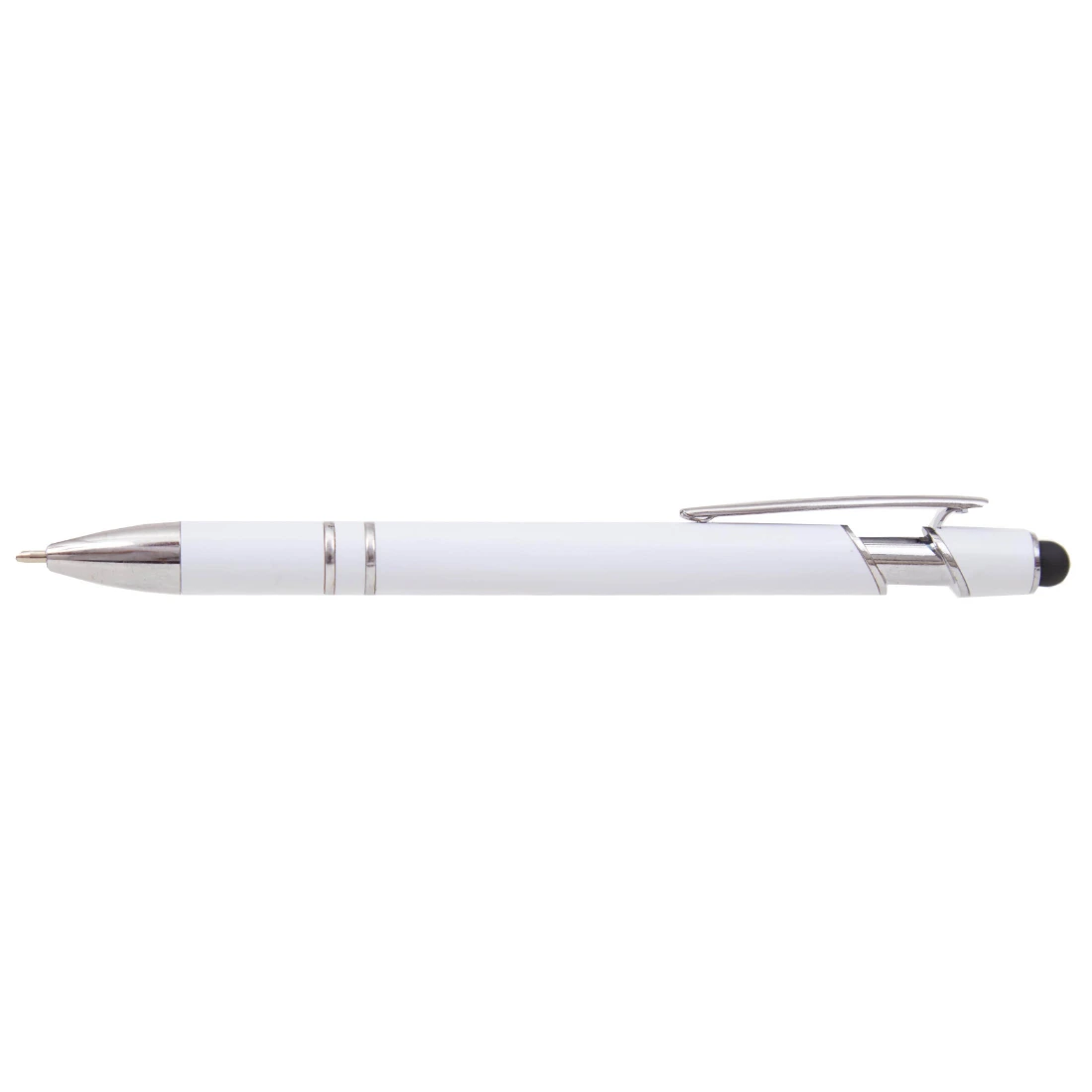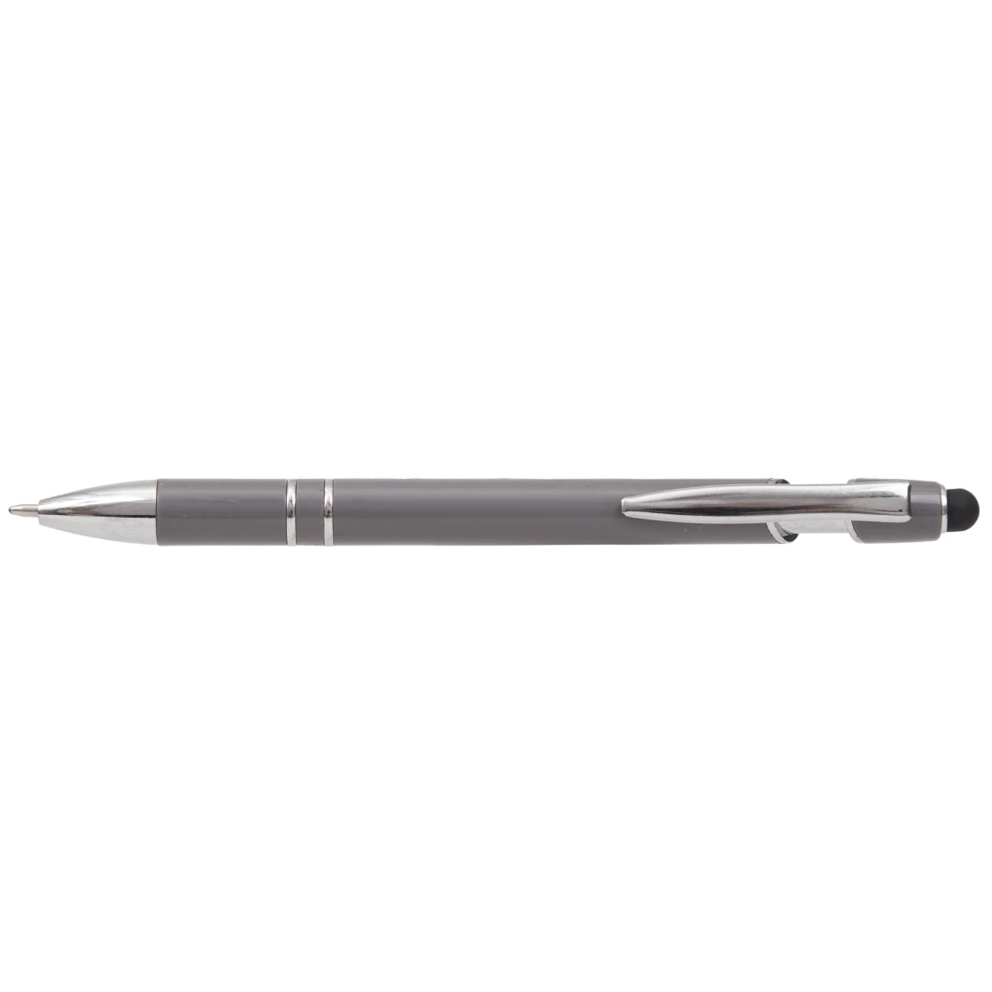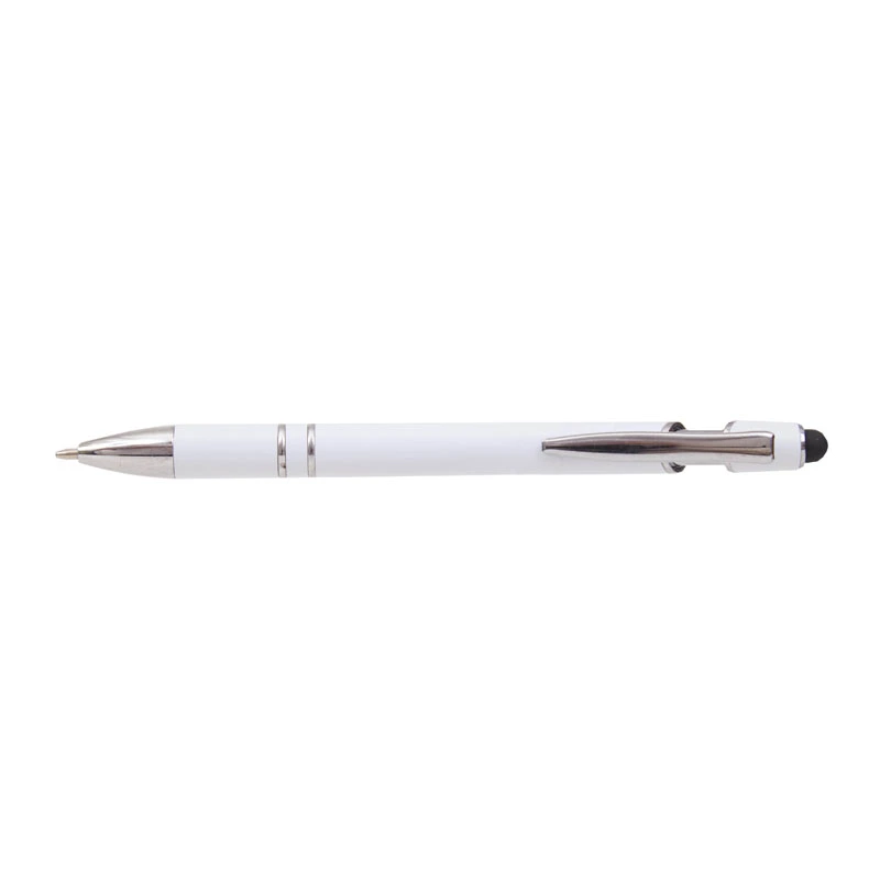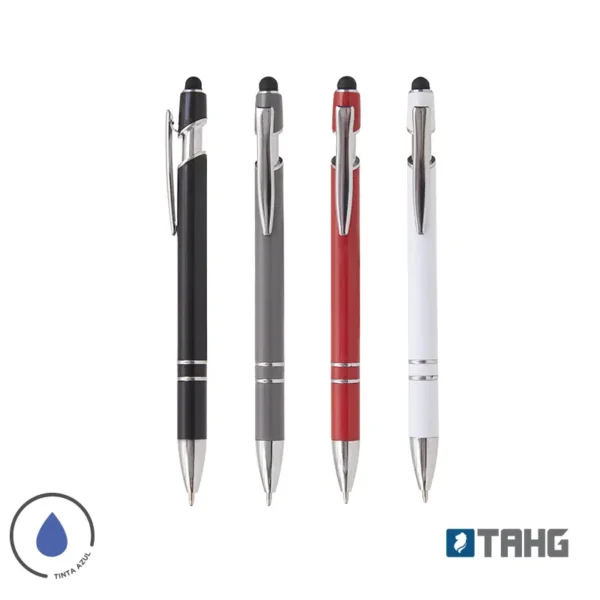 Lápiz de cuerpo sólido, realizado en ABS. Tinta de color azul. Apertura con con clip retractil. Posee touch para pantallas táctiles.
