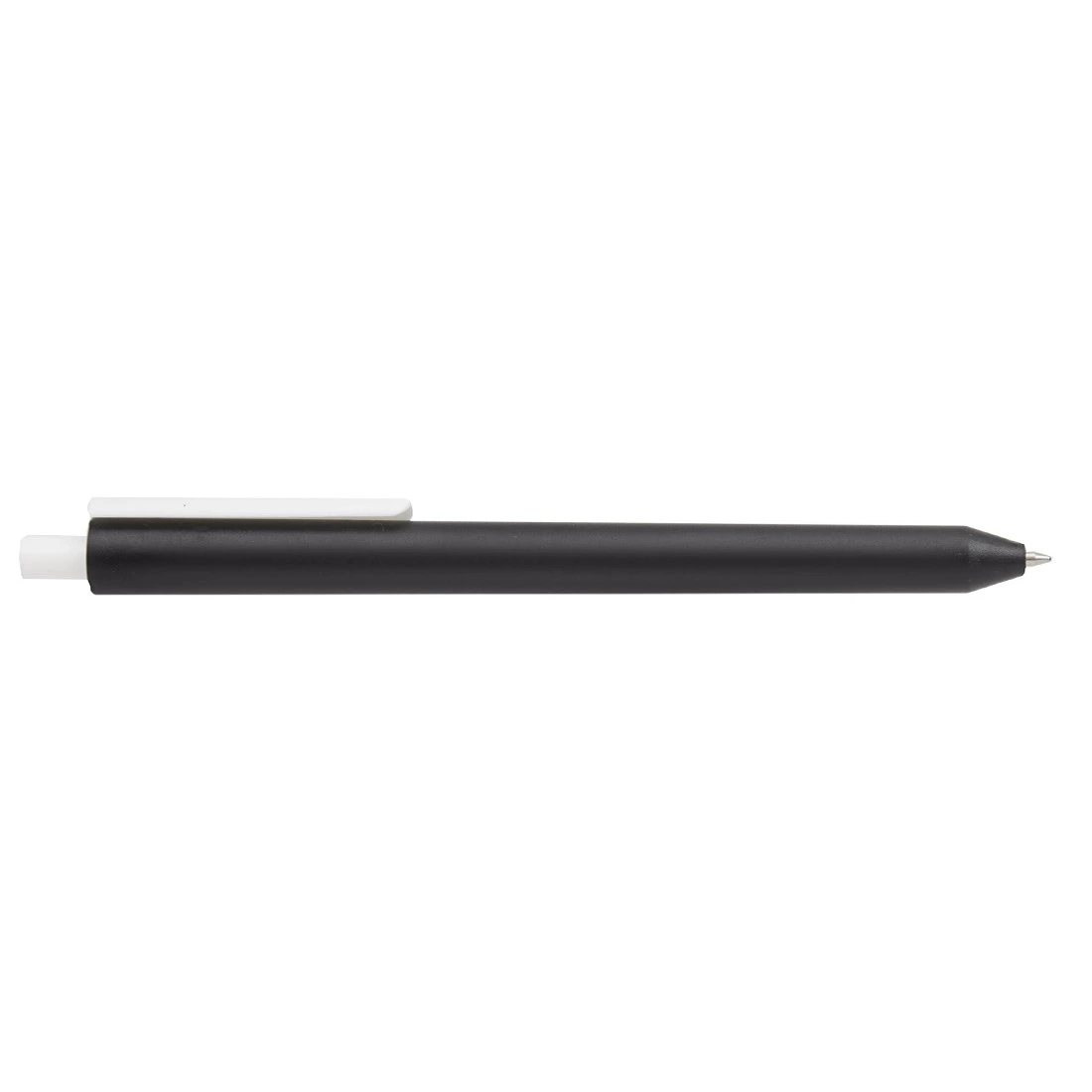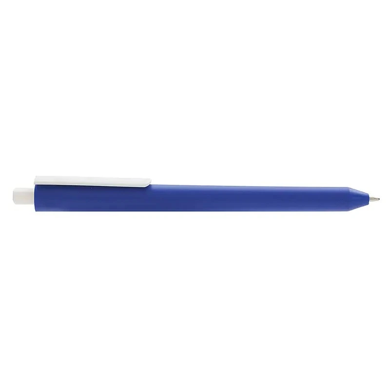 Lápiz confeccionado en ABS, con clip en color blanco. Apertura con pulsador retractil. Tinta azul.