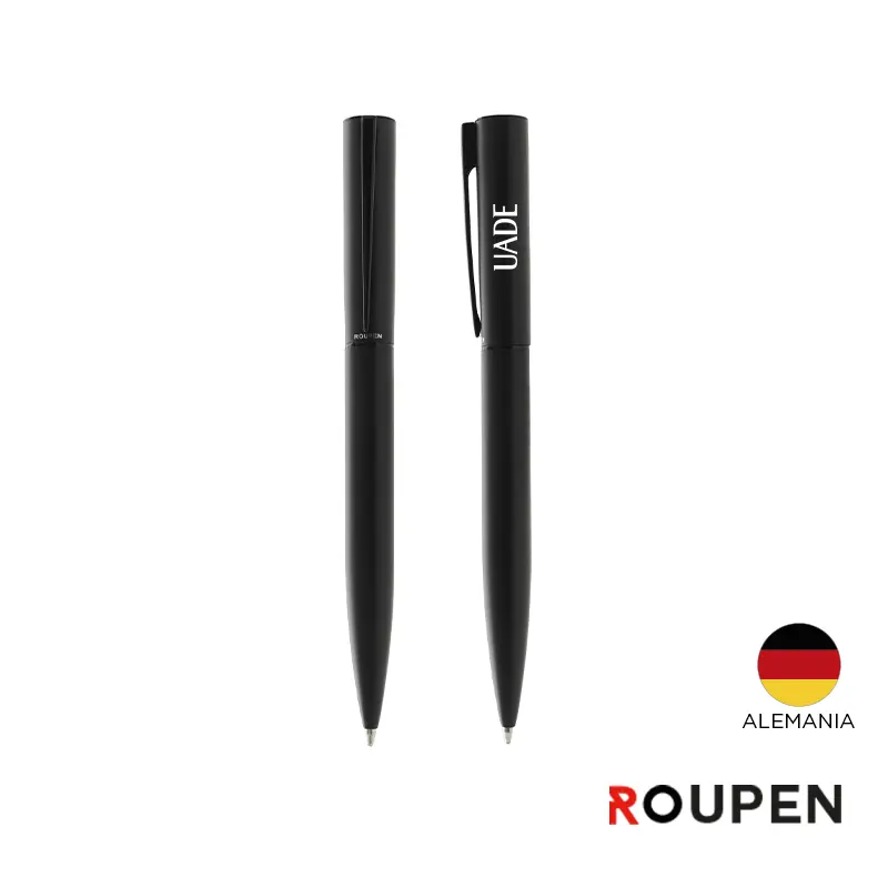Lapiz de acero con detalles en latón, acabado negro mate. Dimensiones: 13,6 x 1,25 cm. Cuenta con tinta azul.