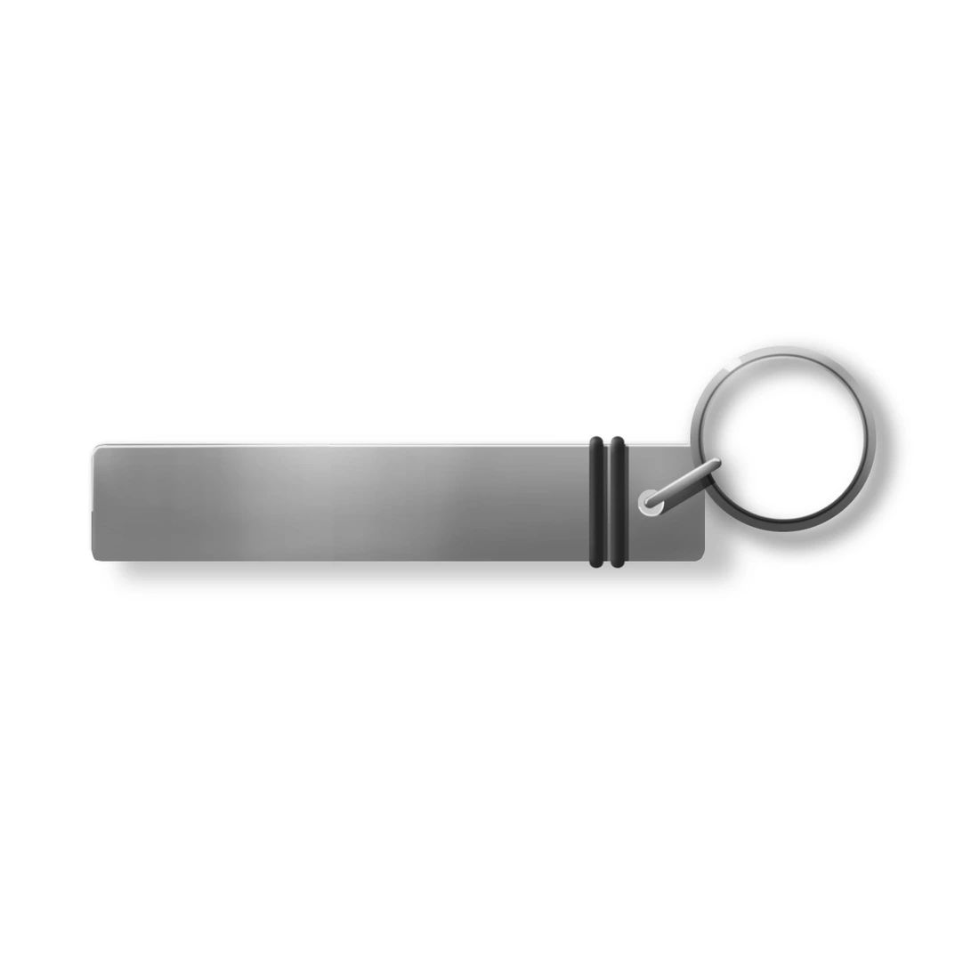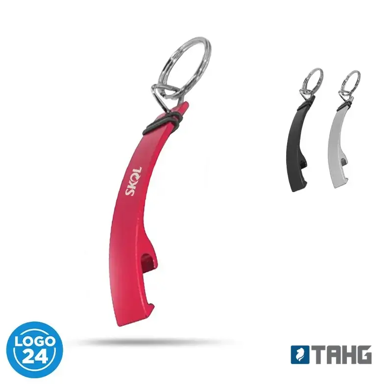 Llavero abrebotellas de metal con grip de goma antideslizante. Medidas: 1,5 x 7,9 x 1,2 cm. (anillo de 24 mm de diámetro).