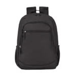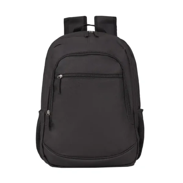 Mochila portanotebook, con respaldar acolchado, confeccionada en 100% polyester. Cuenta con dos bolsillos principales, un segundo bolsillo frontal, y laterales de red para transportar botellas o pequeños objetos.