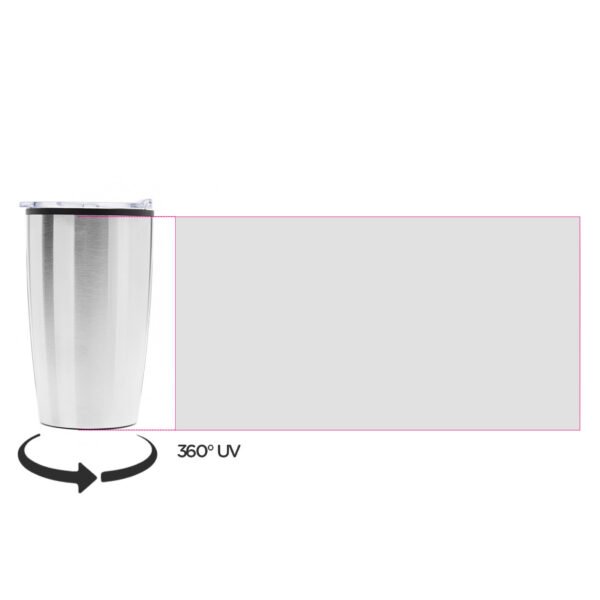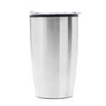 Mug térmico realizado en acero inoxidable en su exterior, y polipropileno de color negro en su interior, con tapa cristal clear y base antideslizante. Interior realizado en plástico. Medidas: 14.5 cm x Diámetro inferior 7,06 cm x Diámetro superior 9,2 cm. Capacidad: 400 ml.