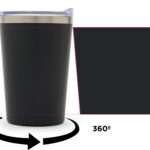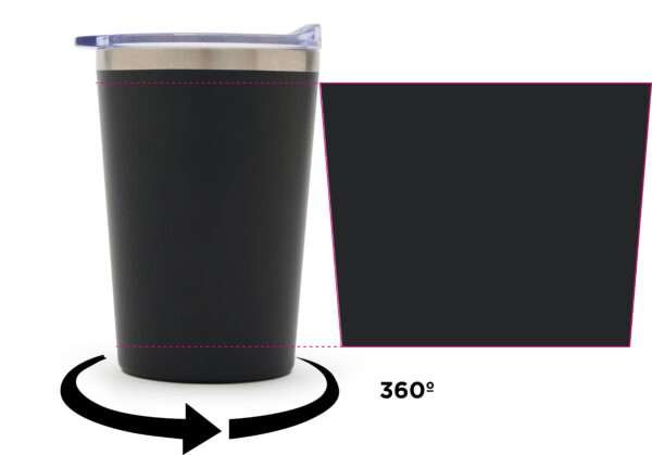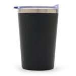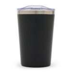 Mug fabricado en acero inoxidable color negro, con tapa antiderrame de acrilonitrilo estireno, garantizando resistencia y durabilidad.