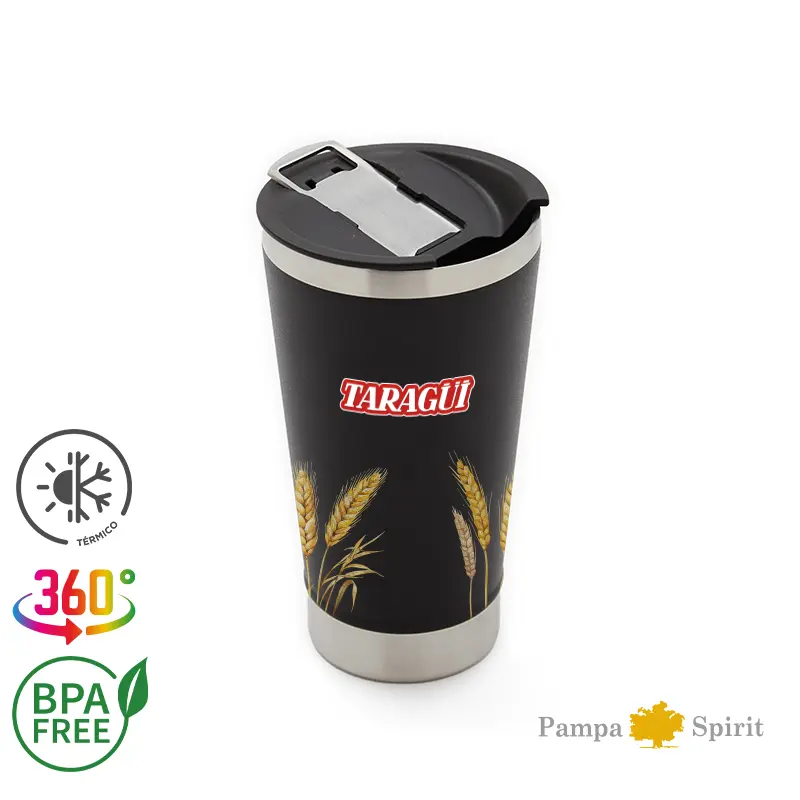 Mug de 600 ml fabricado en doble pared de acero inoxidable, diseñado para mantener la temperatura ideal, ya sea fría o caliente. Su tapa de PP incluye un destapador de botellas, combinando estilo y funcionalidad, perfecto para cualquier ocasión. El producto se presenta en una bolsa de PLA 100% compostable dentro de una caja de cartulina Kraft. Producto libre de BPA, aprobado por el I.N.A.L. para el contacto con alimentos. Pampa Spirit