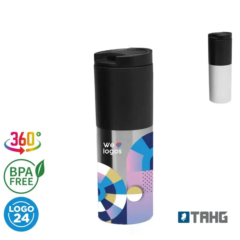 Mug térmico realizado con aluminio e interior de polipropileno negro. Boquilla regulable. Doble pared plástica.