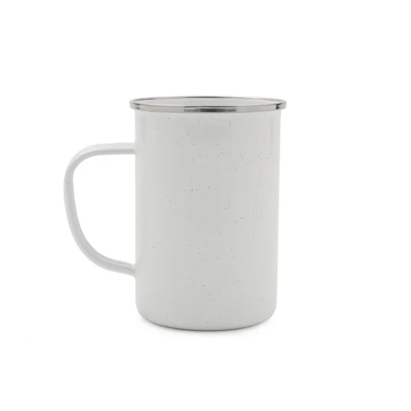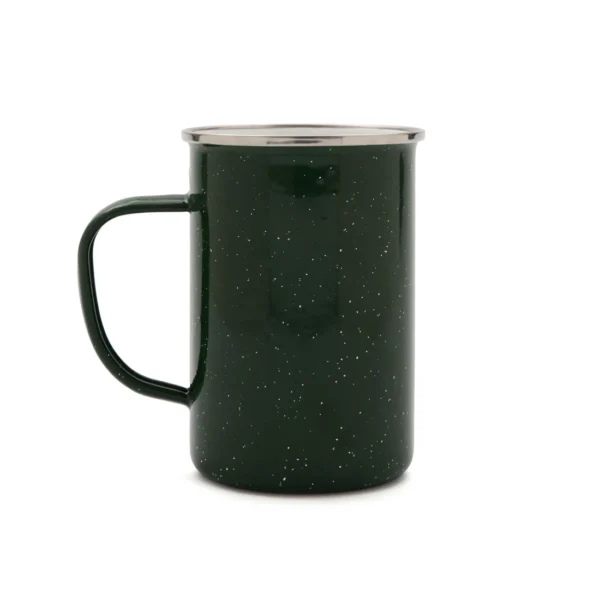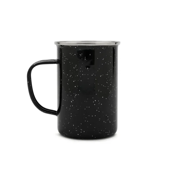 Taza esmaltada de acero inoxidable 304 con acabado en hierro y esmalte, fabricada con materiales duraderos y resistentes, cuenta con diseño clásico y asa ergonómica que asegura un agarre cómodo, es ideal para disfrutar de café, té o infusiones tanto en casa como en la oficina o actividades al aire libre.