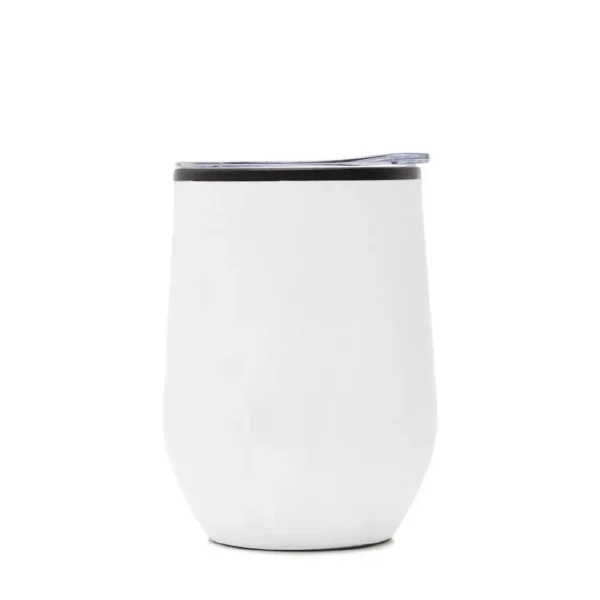 Mug térmico realizado en acero inoxidable esmaltado en su exterior, con interior de polipropileno negro y tapa cristal clear.