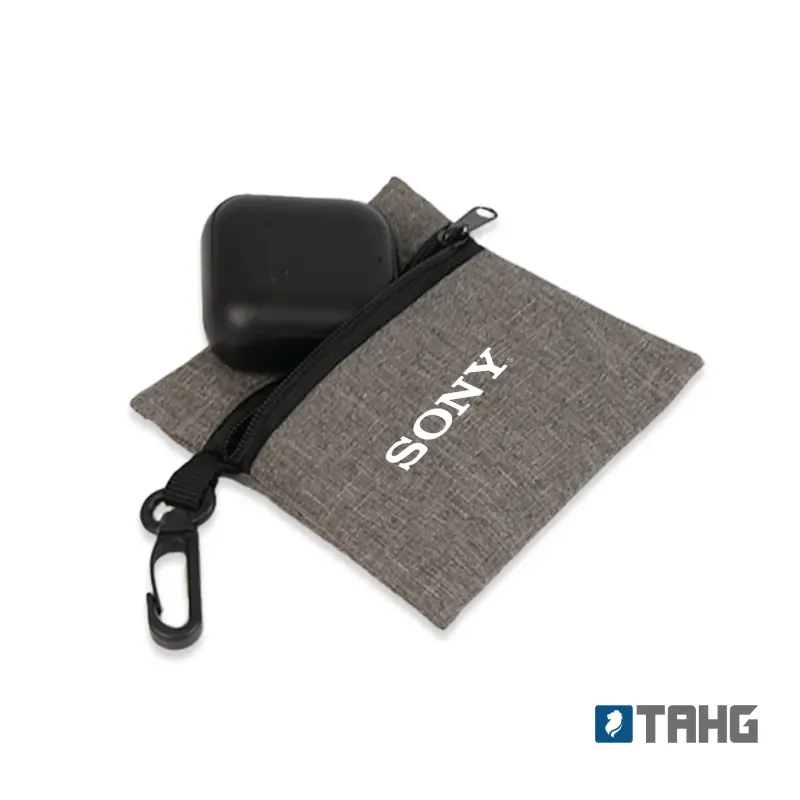 Porta objetos fabricado en poliéster 300D bicolor. Cuenta con cierre y gancho plástico. Es ideal para llevar pequeños accesorios o efectivo.