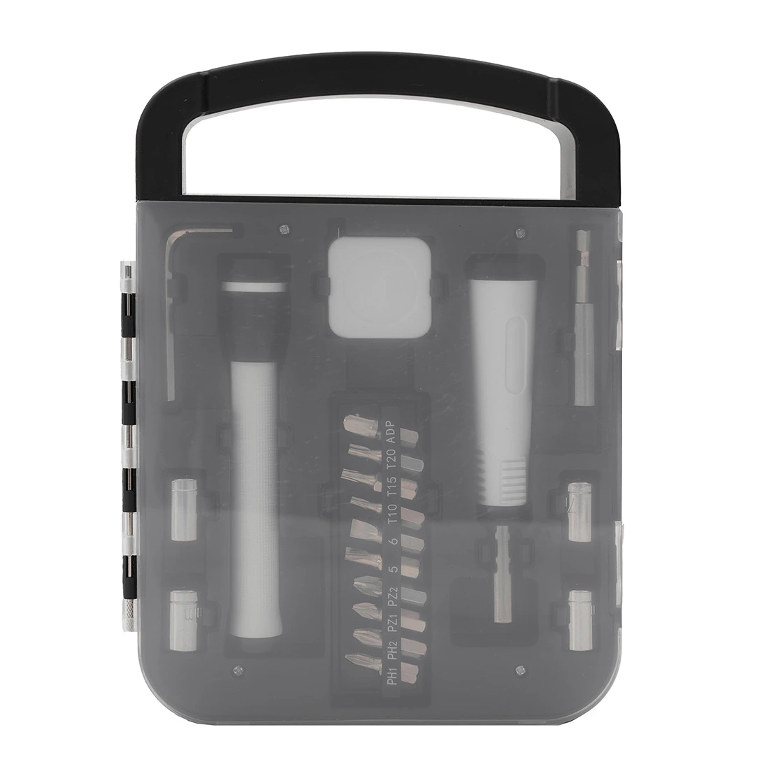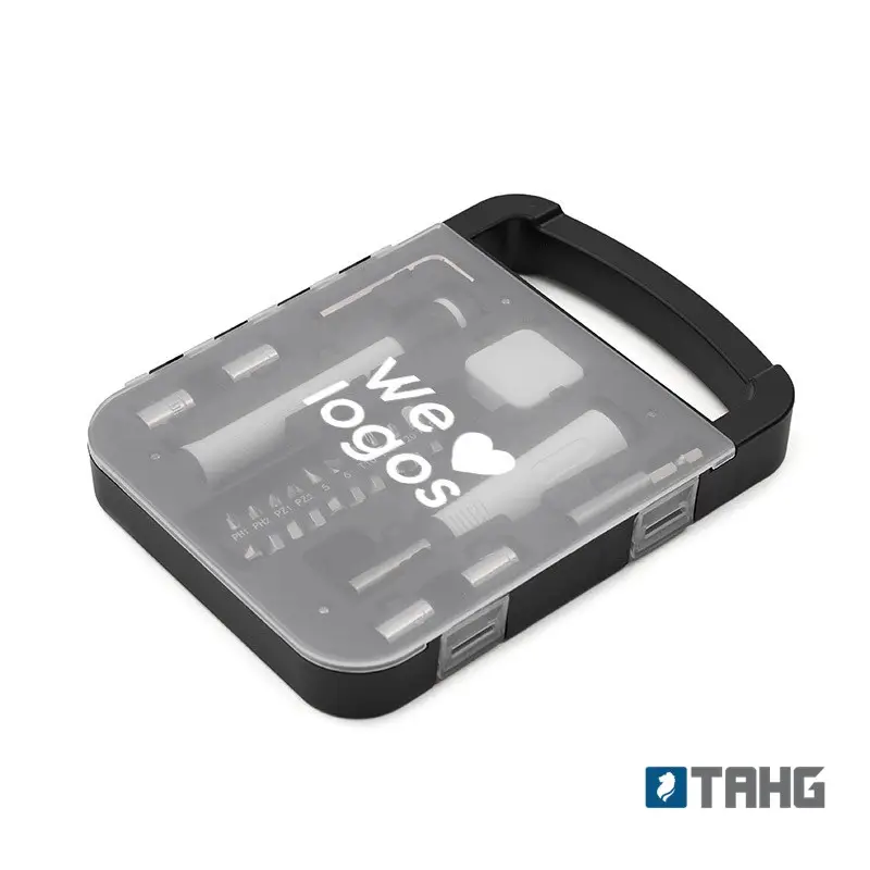 Set de herramientas, con en maletin de tapa transparente. Incluye: Llave allen, linterna, metro extensible, destornillador de puntas intercambiables. Medidas: 22 x 16 x 2,7 cm.