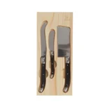 Set de queso de diseño francés con 3 utensillos de distintos tamaños. Los mismos vienen en una cuna de madera. Packaging: caja rígida de cartón laminada, la cual posee una ventana de cristal PVC. Medidas de la caja: 31 x 16 x 6 cm. Producto libre de BPA. Laguiole.