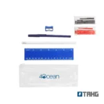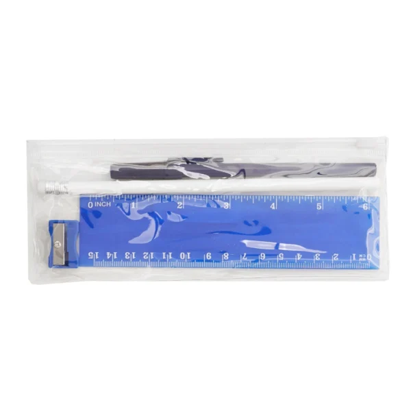 Cartuchera plástica transparente con cierre. Incluye: Lápiz (Tinta Azul), lapiz grafito y regla. Colores: negro, rojo y azul. Medidas: 8 x 20 x 1,2 cm.