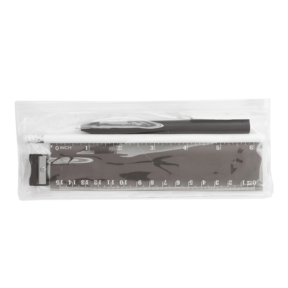 Cartuchera plástica transparente con cierre. Incluye: Lápiz (Tinta Azul), lapiz grafito y regla. Colores: negro, rojo y azul. Medidas: 8 x 20 x 1,2 cm.